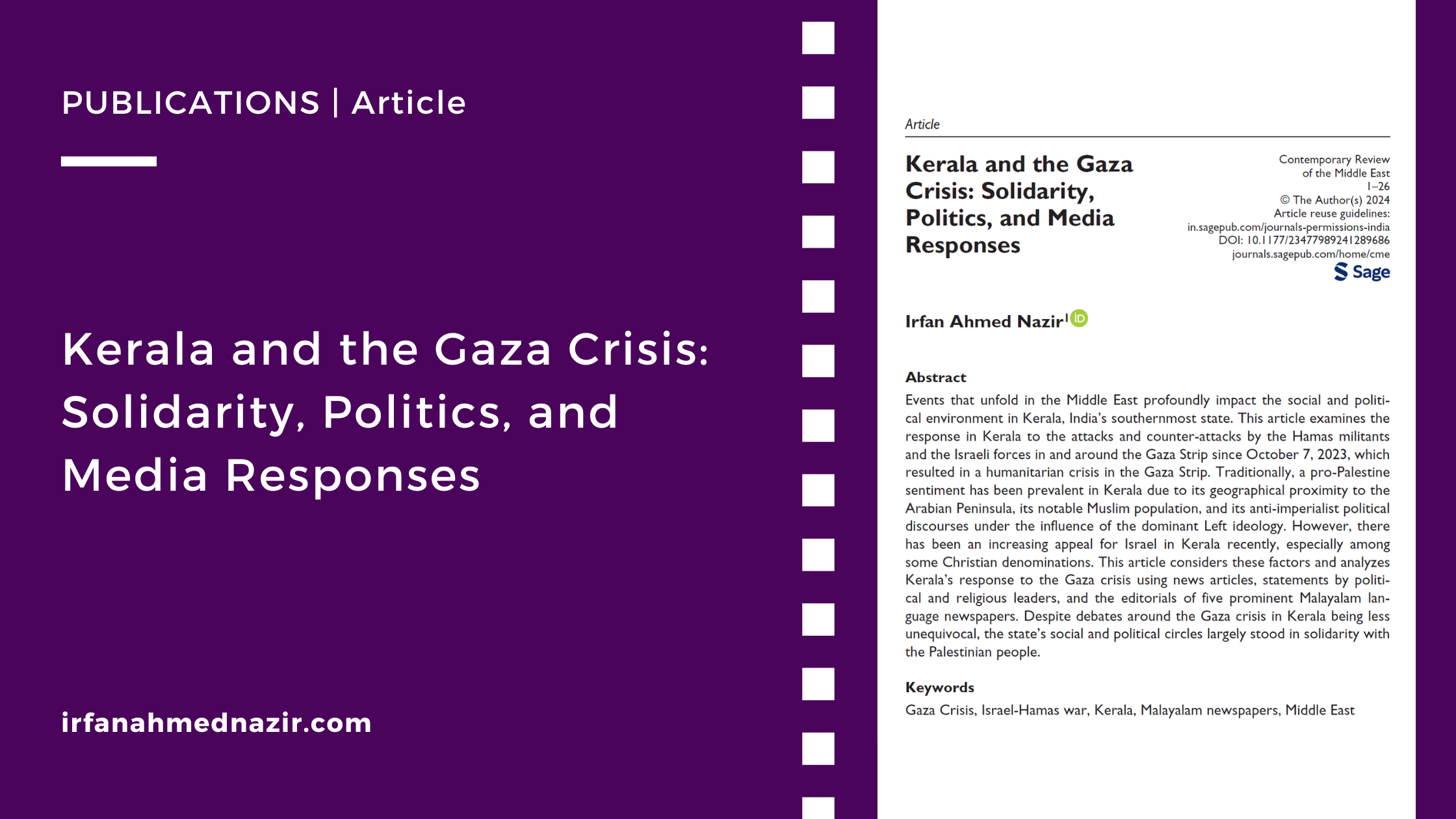 Abstract: Events that unfold in the Middle East profoundly impact the social and political environment in Kerala, India’s southernmost state. This article examines the response in Kerala to the attacks and counter-attacks by the Hamas militants and the Israeli forces in and around the Gaza Strip since October 7, 2023, which resulted in a humanitarian … Continue reading Kerala and the Gaza Crisis: Solidarity, Politics, and Media Responses
